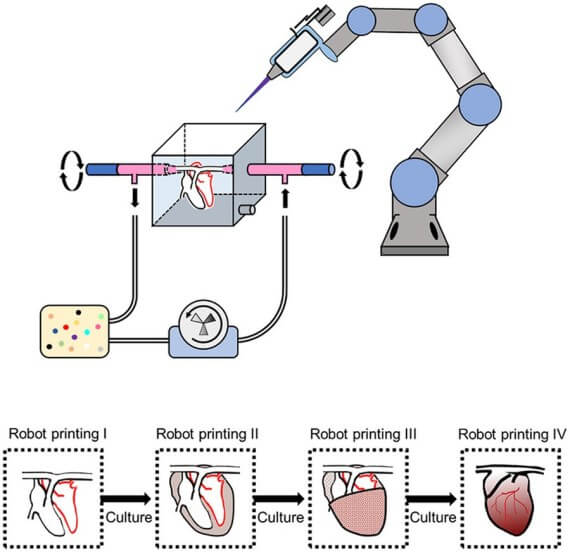 Çin Bilimler Akademisi, Tsinghua Üniversitesi, Manchester Üniversitesi ve Delft Teknoloji Üniversitesi’nden araştırmacılar, altı serbestlik derecesine sahip bir robotik kolu bir biyoyazıcıya dönüştürerek geleneksel biyobaskı sistemlerinin kısıtlamalarını aştı ve böylece her yönden 3D karışık şekilli vasküler yapılarına hücre baskısı yapılmasına imkan sağladı.
