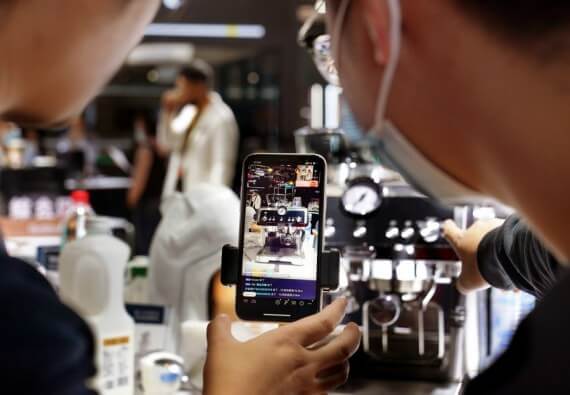 Çin’in doğusundaki Shanghai’da gerçekleşen 4. Çin Uluslararası İthalat Fuarı’nın (CIIE) Tüketici Malları Sergi Alanı’nda internetten canlı yayında kahve makinelerini tanıtan personel.