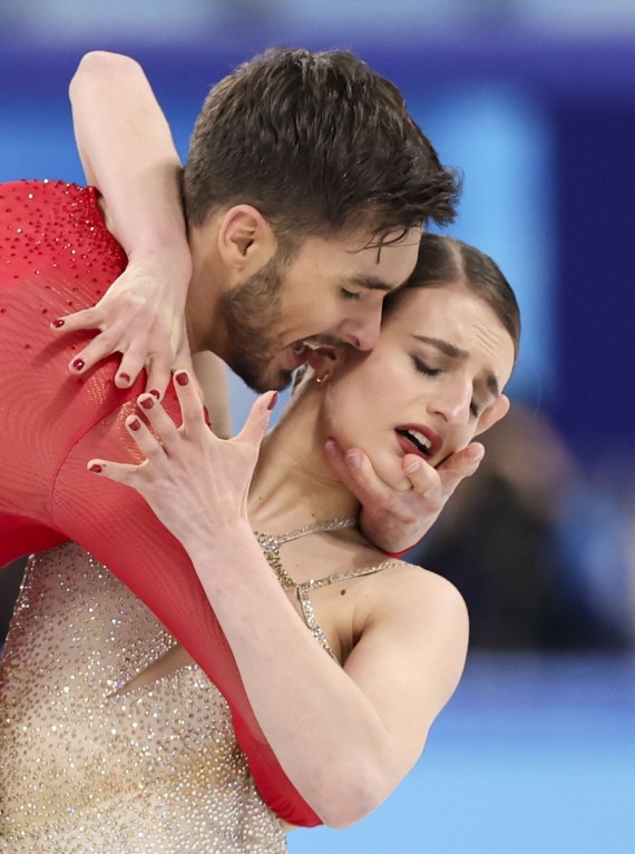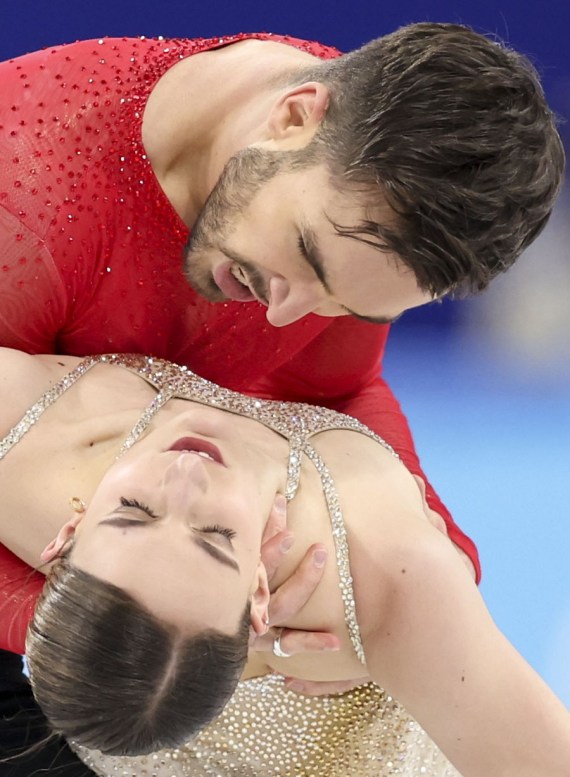 Çin’in başkenti Beijing’deki Başkent Kapalı Stadyumu’nda düzenlenen Beijing 2022 Kış Olimpiyatları artistik buz pateni buz dansı serbest dans programında Fransa’dan Gabriella Papadakis (solda) ile Guillaume Cizeron performans sergiliyor, 14 Şubat 2022. (Wu Wei/Xinhua)
