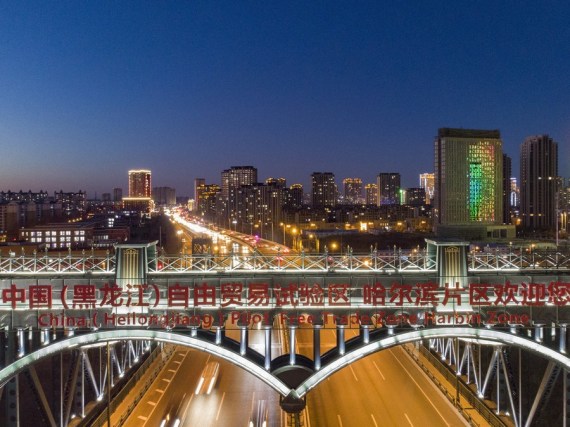 Havadan çekilen fotoğrafta, Çin'in kuzeydoğusunda yer alan Heilongjiang eyaletinde bulunan Harbin'deki Heilongjiang pilot serbest ticaret bölgesinin (FTZ) alt bölgesinin girişi görülüyor, 13 Kasım 2020. (Fotoğraf: Zhang Tao/Xinhua)