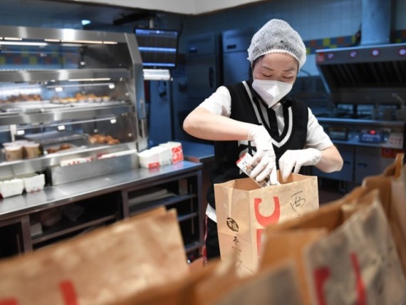 Çin'in kuzeybatısındaki Shaanxi eyaletinin merkezi Xi'an'daki bir restoranda paket siparişlerini hazırlayan bir personel, 13 Ocak 2022. (Fotoğraf: Li Yibo/Xinhua)