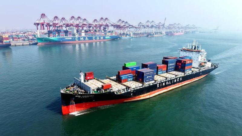 Drone ile çekilen fotoğrafta Çin'in doğusundaki Shandong eyaletinin Qingdao kentinde bulunan Qingdao Limanı'na gelen bir konteyner gemisi görülüyor, 1 Nisan 2026. (Fotoğraf: Yu Fangping/Xinhua)