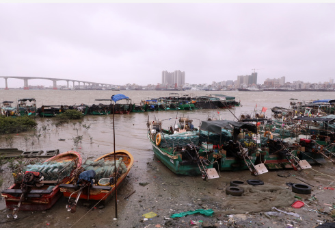 Çin’in güneyindeki Guangdong eyaletinin Maoming şehrinde, rüzgardan korunmak için Bohewan Köprüsü yakınlarına sığınan balıkçı tekneleri, 2 Temmuz 2022.