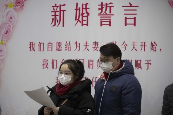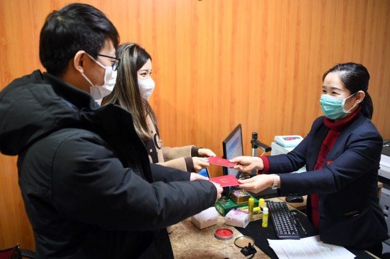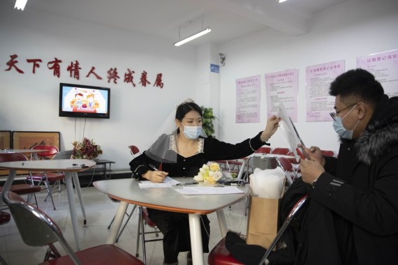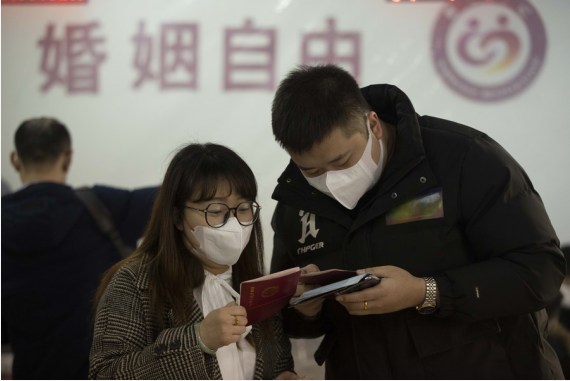 Çin’in kuzeydoğusundaki Heilongjiang eyaletinin merkezi Harbin’de bulunan Daoli bölgesindeki nikah dairesinde evlenmek için kayıt yaptıran bir çift, 22 Şubat 2022. (Fotoğraf: Zhang Tao/Xinhua)