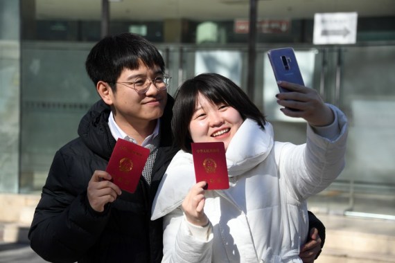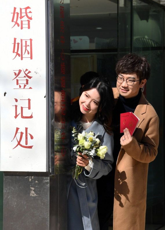 Çin’in başkenti Beijing’de bulunan Haidian bölgesindeki nikah dairesinin dışında evlilik cüzdanlarıyla poz veren bir çift, 22 Şubat 2022. (Fotoğraf: Ren Chao/Xinhua)