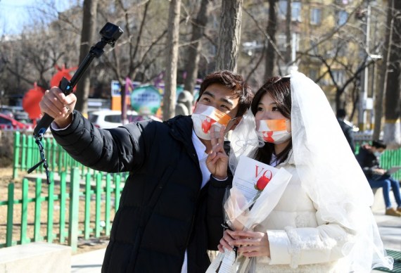 Çin'in kuzeydoğusundaki Heilongjiang eyaletinin merkezi Harbin'de bulunan Daoli bölgesindeki nikah dairesinde poz veren bir çift, 22 Şubat 2022. (Fotoğraf: Zhang Tao/Xinhua)