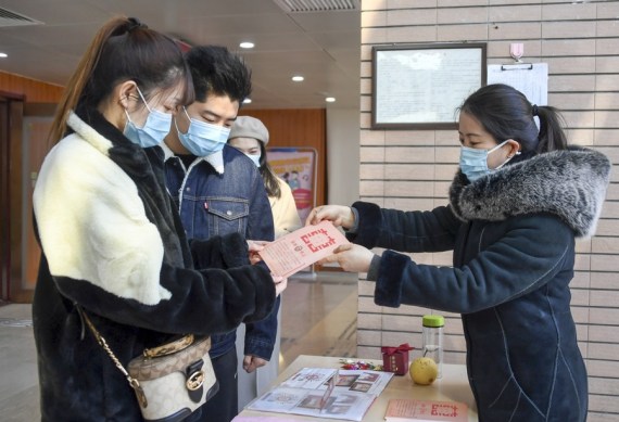 Çin’in başkenti Beijing’de bulunan Haidian bölgesindeki nikah dairesinde bir çifte hatıra kartı veren bir personel (Sağda), 22 Şubat 2022. (Fotoğraf: Ren Chao/Xinhua)