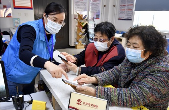 Bir gönüllü, Çin'in başkenti Beijing'in Fengtai Bölgesi'ndeki bir toplulukta yaşlıların çevrimiçi ödeme uygulaması kullanmasına yardımcı oluyor, 12 Kasım 2021. (Fotoğraf: Li Xin/Xinhua)