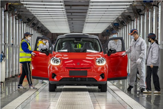Çin'in doğusundaki Zhejiang eyaletinin Jinhua kentinde yeni enerjili araç üretimi yapan bir otomobil şirketinin son montaj atölyesinde çalışan işçiler görülüyor, 17 Aralık 2021. (Fotoğraf: Hu Xiaofei/Xinhua)