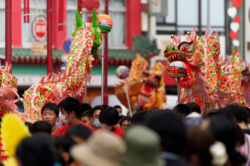 Arşiv fotoğrafında Japonya'nın Yokohama kentindeki Çin Mahallesi'nde ejderha dansı performansı izleyen turistler görülüyor, 1 Ekim 2023. (Fotoğraf: Zhang Xiaoyu/Xinhua)