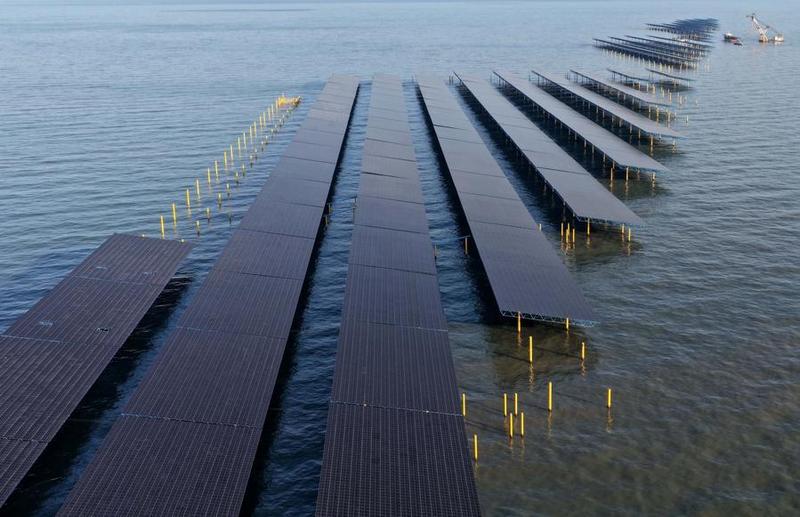 Drone ile çekilen fotoğrafta, Çin'in kuzeyindeki Hebei eyaletinin Changli ilçesi açıklarında yer alan açık deniz fotovoltaik enerji santralindeki güneş panelleri görülüyor, 24 Aralık 2025. (Fotoğraf: Yang Shiyao/Xinhua)