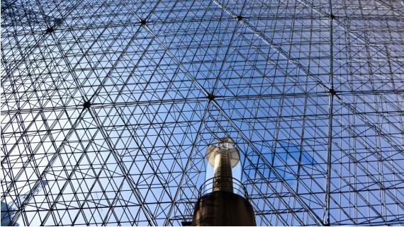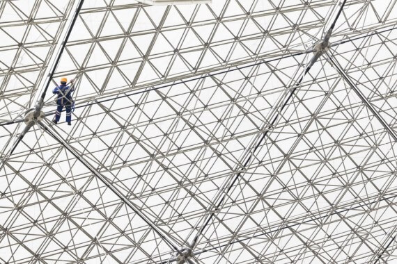Çin’in güneybatısındaki Guizhou eyaletinde Çin’in 500 metrelik Diyaframlı Küresel Radyo Teleskobu (FAST) üzerinde bakım çalışmaları yapan bir personel.