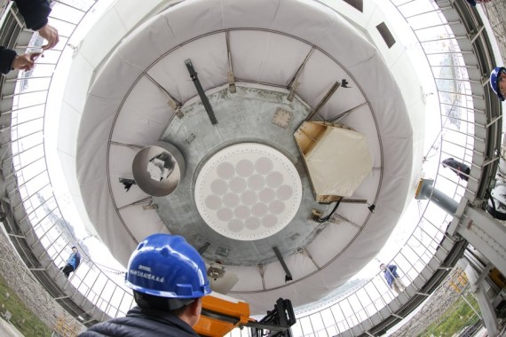 Çin’in güneybatısındaki Guizhou eyaletinde Çin’in 500 metrelik Diyaframlı Küresel Radyo Teleskobu (FAST) üzerinde bakım çalışmaları yapan personel.