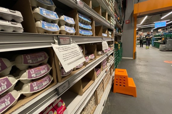 Belçika'nın başkenti Brüksel'de bir süpermarkette yumurtaların bulunduğu rafa asılı Fransızca ve Hollandaca, "Kuş gribi nedeniyle serbest gezen tavuk yumurtaları geçici bir süreyle zorunlu olarak kapalı alanda tutulan tavuklardan gelmektedir" anlamına gelen duyuru görülüyor, 29 Mart 2022. (Fotoğraf: Zheng Huansong/Xinhua)
