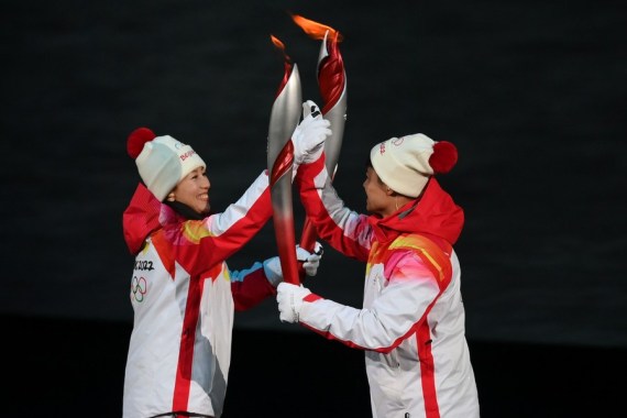 Çin'in başkenti Beijing'deki Ulusal Stadyum'da Beijing 2022 Olimpiyat Kış Oyunları'nın açılış töreni sırasında meşale taşıyıcısı Yang Yang (solda) olimpiyat ateşini, meşale taşıyıcısı Su Bingtian'a verdi, 4 Şubat 2022. (Fotoğraf: Xue Yuge/Xinhua)