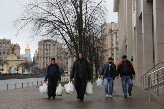 Ukrayna’nın başkenti Kiev’de günlük ihtiyaçlarını aldıktan sonra sokakta yürüyen vatandaşlar, 24 Şubat 2022. (Fotoğraf: Li Dongxu/Xinhua)