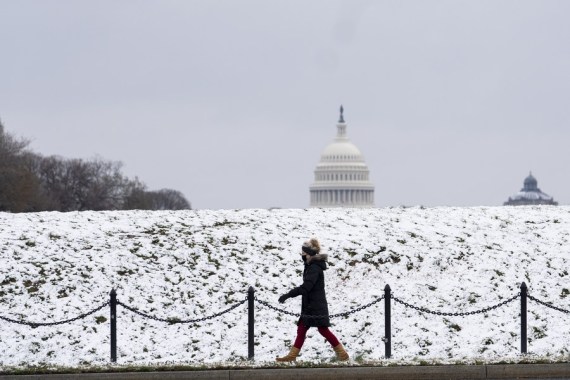 ABD'nin Washington D.C. kentinde bir kadın kar yağışının ardından Kongre binasının yakınında yürüyor, 12 Mart 2022. (Fotoğraf: Liu Jie/Xinhua)