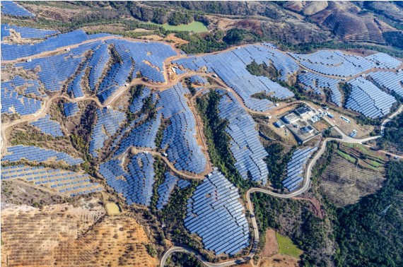 Havadan çekilen fotoğrafta, Çin'in güneybatısındaki Yunnan eyaletine bağlı Chuxiong Yi Özerk İli'nin Yongren İlçesindeki fotovoltaik elektrik santrali görülüyor, 16 Şubat 2022. (Fotoğraf: Chen Xinbo/Xinhua)