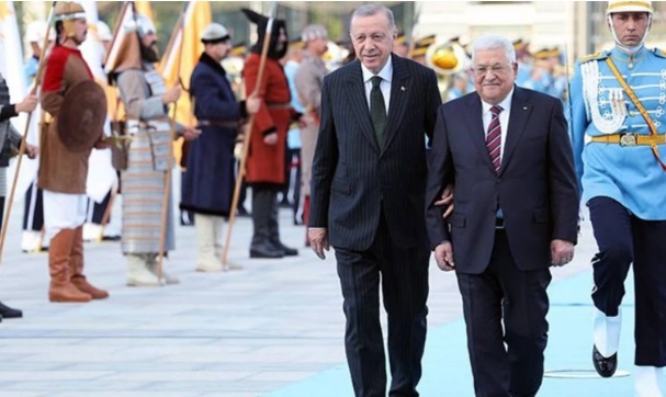 Erdoğan ve Mahmud Abbas’ın tören alanındaki yerlerini almalarının ardından, 21 pare top atışı eşliğinde iki ülke milli marşları çalındı. Filistin Devlet Başkanı Abbas, Muhafız Alayı Tören Kıtası’nı, “Merhaba asker” diyerek Türkçe selamladı.