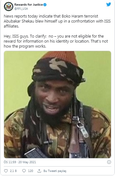 Mayıs ayında Şekau’nun ölümüyle ilgili haberlerin yayınlanmasının ardından ABD, Boko Haram liderinin başına konulan 7 milyon dolar para ödülünü ISWAP’ın almayacağını açıklamıştı. Twitter paylaşımında, “Hey, IŞİD’in adamları. Onun kimliği ya da yeri için ödül almaya uygun değilsiniz. Bu program böyle çalışmıyor” denilmişti.