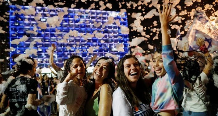Rabin Meydanı’nda kutlama yapan İsrailliler, daha sonra Tel Aviv’de Habima Meydanı‘na doğru yürüyüşe geçti.