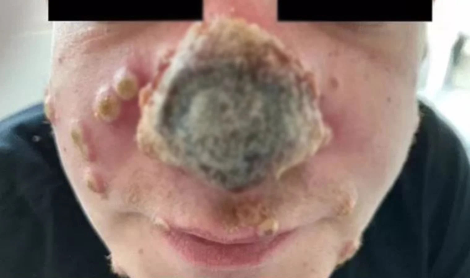 Almanya’da 40 yaşındaki kişi, burnunda güneş yanığı olduğu düşünülen kırmızı bir noktayı göstermek için doktora gitti. Ama üç gün içinde burnundaki deri ölmeye ve siyaha dönmeye başladı. Dayanılmaz bir ağrı yaşamaya başlayan adamın burnu çürümeye başladı.
