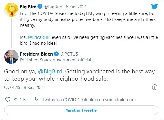 Biden, “Tebrikler Minik Kuş. Aşı yaptırmak semti güvenli hale getirmenin en iyi yoludur” diyerek destekleyici bir cevap verdi.
