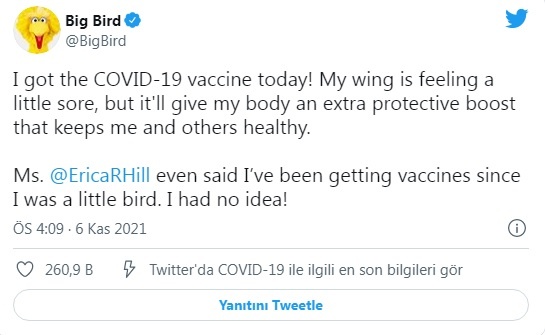 Minik Kuş karakteri, resmi Twitter hesabından koronavirüs aşısı olduğunu ilan etmesiyle beraber, Cumhuriyetçi Parti Teksas Senatörü Ted Cruz’un eleştirilerine maruz kaldı.