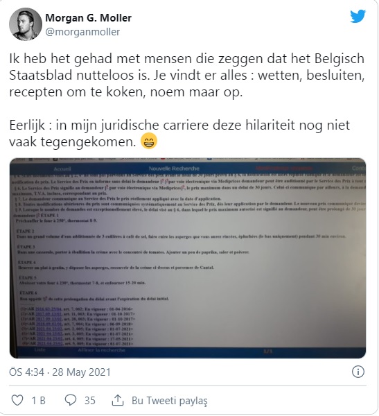 Yemeğin 6 adımda nasıl yapılacağını anlatan tarifin Resmi Gazete’de yer aldığını Morgan Moller isimli Belçikalı avukat fark etti.
