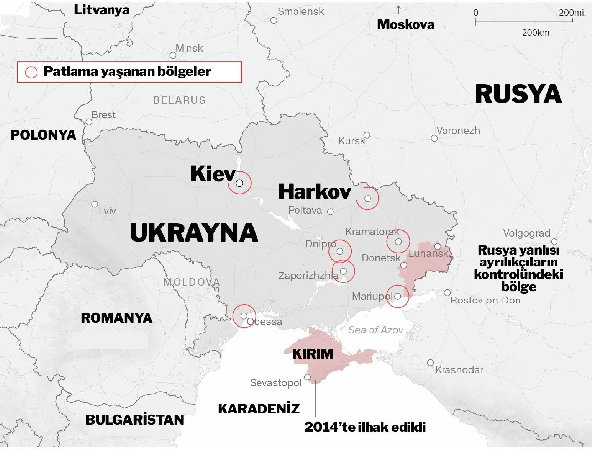 Şu ana kadar Harkov, Kiev, Kramatorsk, Dnipro, Zaporizhzhia, Mariupol ve Odessa’da patlama seslerinin yükseldiği belirtildi.