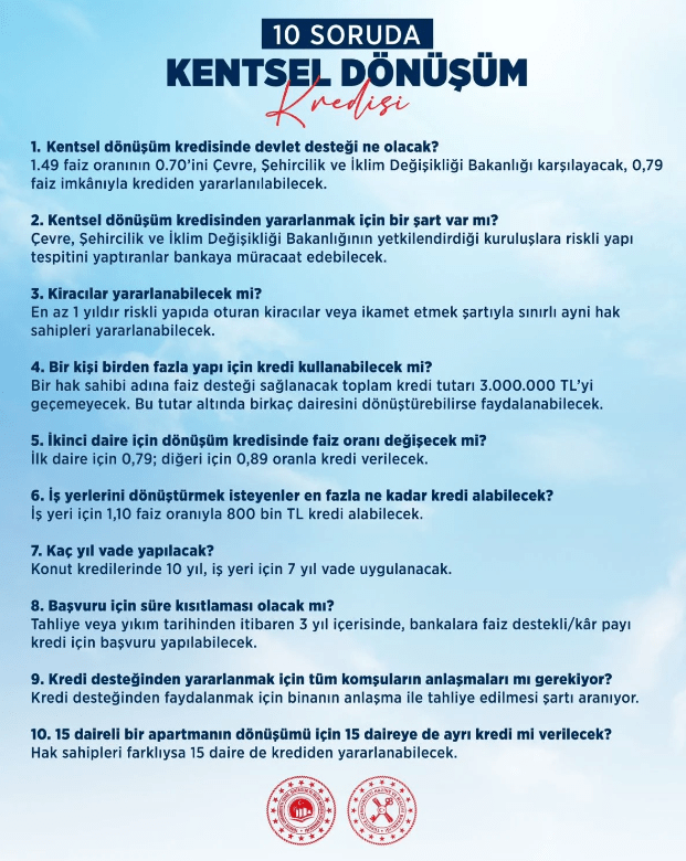 Hazine ve Maliye Bakanlığı, geçen hafta kamuoyuna duyurulan “Kentsel Dönüşüm Kredisi”nin detaylarını 10 soruya verdiği cevaplarla derledi.