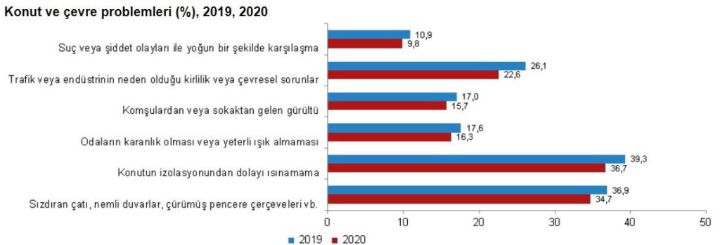 Kurumsal olmayan nüfusun yüzde 36,7’si konutunda izolasyondan dolayı ısınma sorunu, yüzde 34,7’si sızdıran çatı, nemli duvarlar, çürümüş pencere çerçeveleri vb. problemleri yaşarken yüzde 22,6’sı trafik veya endüstrinin neden olduğu hava kirliliği, çevre kirliliği veya diğer çevresel sorunlarla karşılaştı.