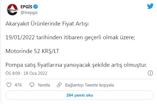 EPGİS’ten yapılan açıklamaya göre, zam pompa fiyatlarına yansıyacak. Buna göre, motorine 52 kuruş zam geldi. Zam 19 Ocak 2022 itibariyle geçerli olacak.