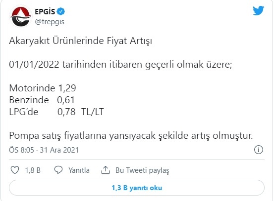 EPGİS’ten yapılan açıklamaya göre, zam pompa fiyatlarına yansıyacak. Zam, 1 Ocak 2022 itibariyle geçerli olacak.