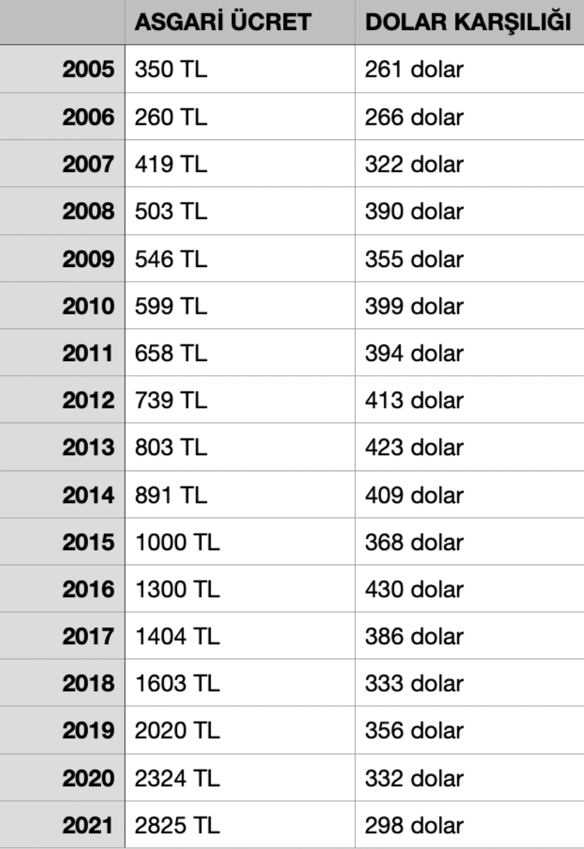 2022 yılı için asgari ücret görüşmeleri, böyle bir atmosferde aralık ayında başlayacak. İktidara yakın A Haber ise, ‘son 45 yılın en iyi zammının yapılacağı’ görüşünde. Peki asgari ücretin, Türk lirasından 6 sıfırın atıldığı 2005 yılından bu yana dolar karşısında durumu ne oldu?