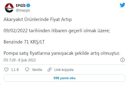 Akaryakıt zammı Enerji Petrol Gaz İkmal İstasyonları İşveren Sendikası (EPGİS) tarafından açıklandı. Kurumun sosyal medya hesabından yaptığı paylaşımda benzine zam geldiği bilgisi paylaşıldı.