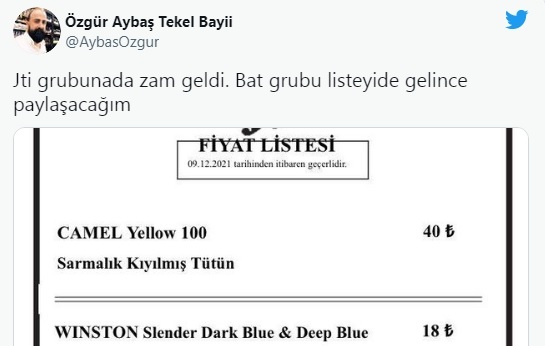 Zam haberleri art arda gelmeye devam ederken bir sigara grubuna daha zam geldi. Türkiye Tekel Bayiler Platformu Başkanı Özgür Aybaş, zam haberini sosyal medya hesabından duyurdu.