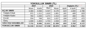 Birleşik Kamu-İş’in Ar-Ge birimi KAMU-AR, dört kişilik bir ailenin dengeli ve sağlıklı beslenebilmesi için tüketmesi gereken gıda miktarlarını esas alarak açlık sınırını ve gıda dışındaki harcamaları dikkate alarak yoksulluk sınırını hesapladığı araştırmasının Nisan 2022 sonuçlarını yayınladı.