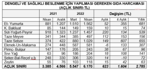 Birleşik Kamu İş’in araştırmasına göre; dört kişilik bir ailenin açlık sınırı, nisanda bir önceki aya göre 623 lira artarak 6 bin 170 liraya yükseldi. Dört kişilik bir ailenin gıda dışı zorunlu harcamaları ise 693 lira artışla 12 bin 304 liraya çıktı. Böylece dört kişilik bir ailenin yoksulluk sınırı 18 bin 474 lira olarak hesaplandı.