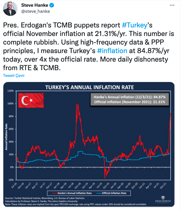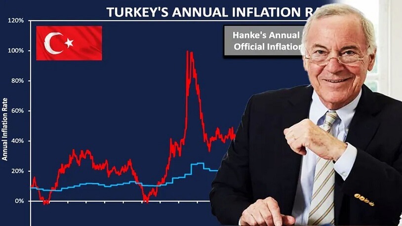 Hanke kasım ayında, TCMB’nin ekim ayı enflasyon oranını yüzde 19 olarak açıklamasına itiraz etmiş ve Türkiye’deki enflasyonun yüzde 58 olduğunu öne sürmüştü.