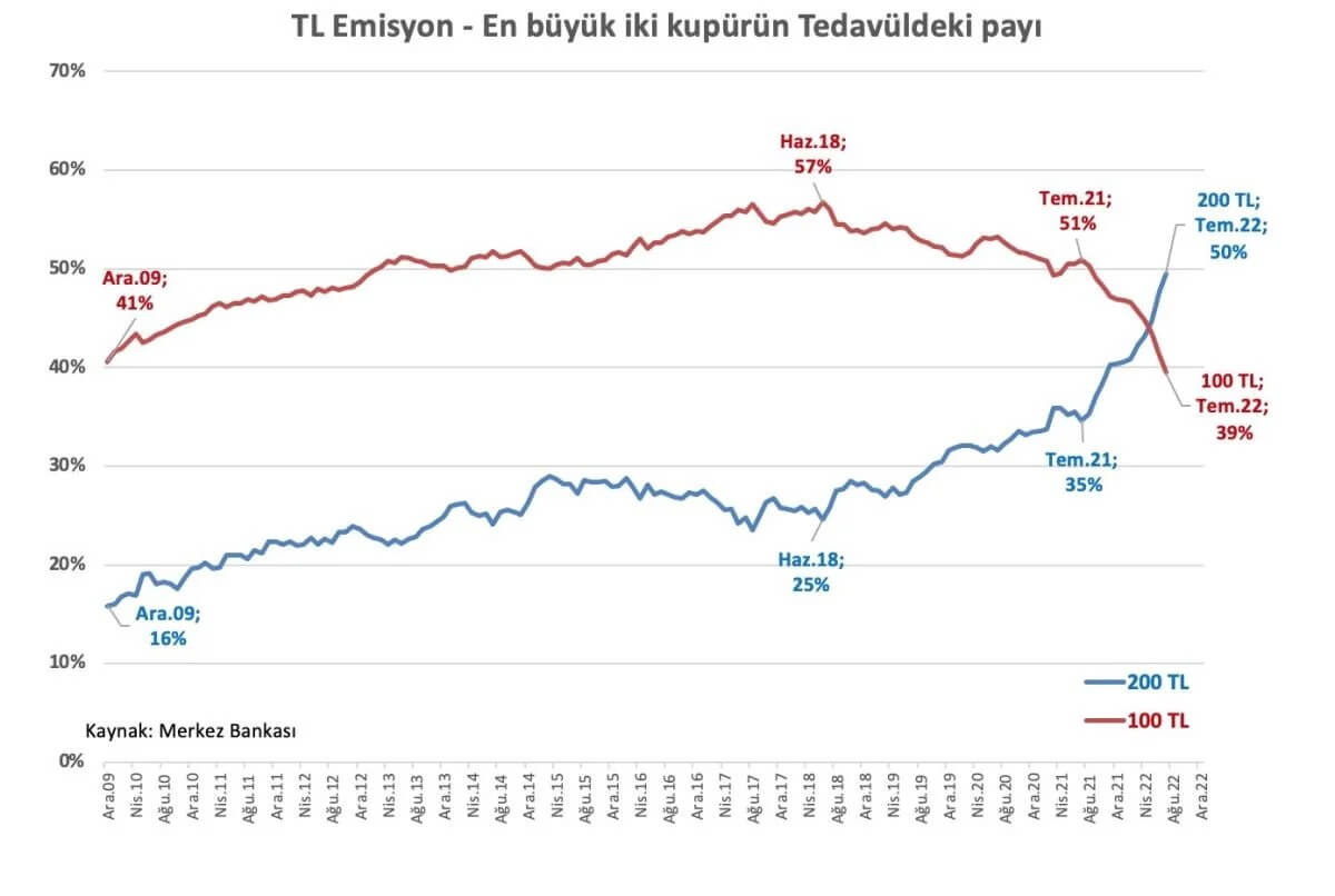 Temmuz'da, tedavüldeki kağıt paralar içinde 200'lüklerin payı % 50'ye vurdu. Önceki yıl % 35, Başkanlık rejimine geçilen Haziran 2018'de % 25 idi. TL'nin satın alma gücü hızla eriyor.