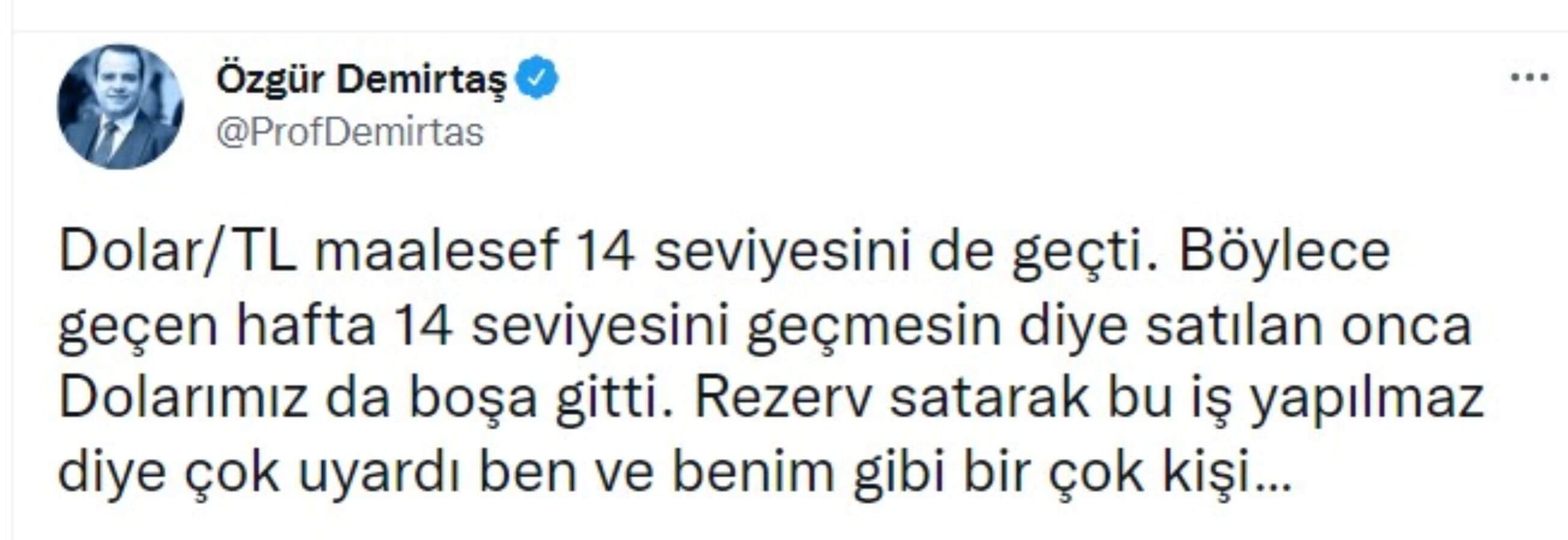 Ekonomist Özgür Demirtaş ise, ”Dolar/TL maalesef 14 seviyesini de geçti. Böylece geçen hafta 14 seviyesini geçmesin diye satılan onca dolarımız da boşa gitti. Rezerv satarak bu iş yapılmaz diye çok uyardı ben ve benim gibi bir çok kişi…” paylaşımını yaptı.