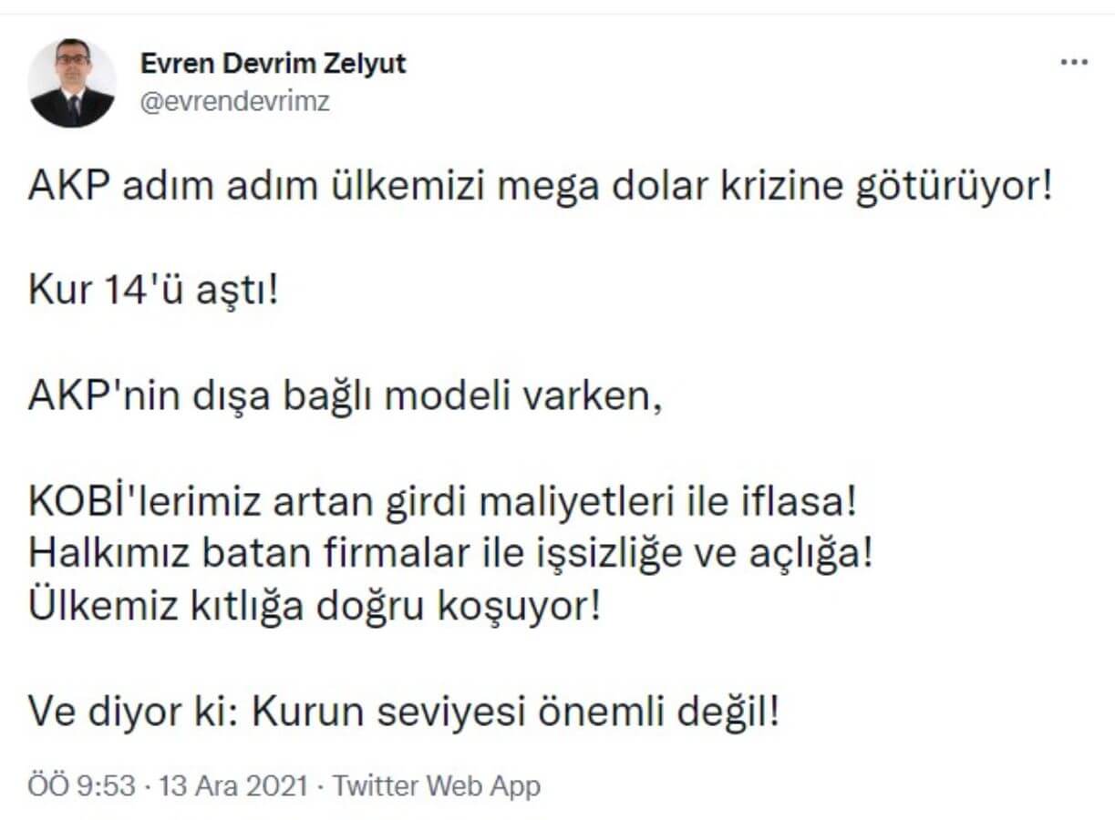 Sosyal medya hesabından paylaşım yapan bir diğer isim ekonomist Evren Devrim Zelyut ise, ”AKP adım adım ülkemizi mega dolar krizine götürüyor! Kur 14’ü aştı! AKP’nin dışa bağlı modeli varken, KOBİ’lerimiz artan girdi maliyetleri ile iflasa! Halkımız batan firmalar ile işsizliğe ve açlığa! Ülkemiz kıtlığa doğru koşuyor! Ve diyor ki: Kurun seviyesi önemli değil” diyerek tepkisini belirtti.