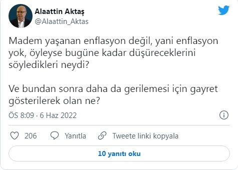 Aktaş, Twitter hesabından yaptığı açıklamada, “Madem yaşanan enflasyon değil, yani enflasyon yok, öyleyse bugüne kadar düşüreceklerini söyledikleri neydi? Ve bundan sonra daha da gerilemesi için gayret gösterilerek olan ne?” dedi.