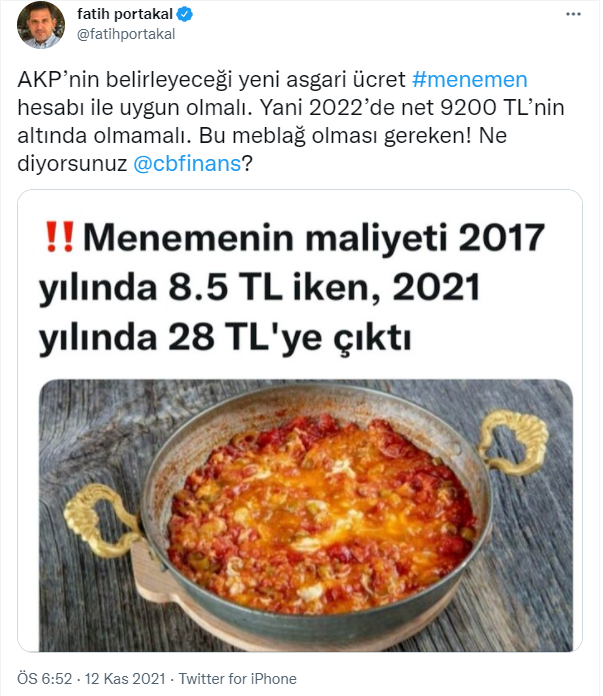 Asgari ücret tartışmalarına ilişkin yazan Portakal, ”AKP’nin belirleyeceği yeni asgari ücret #menemen hesabı ile uygun olmalı” dedi.