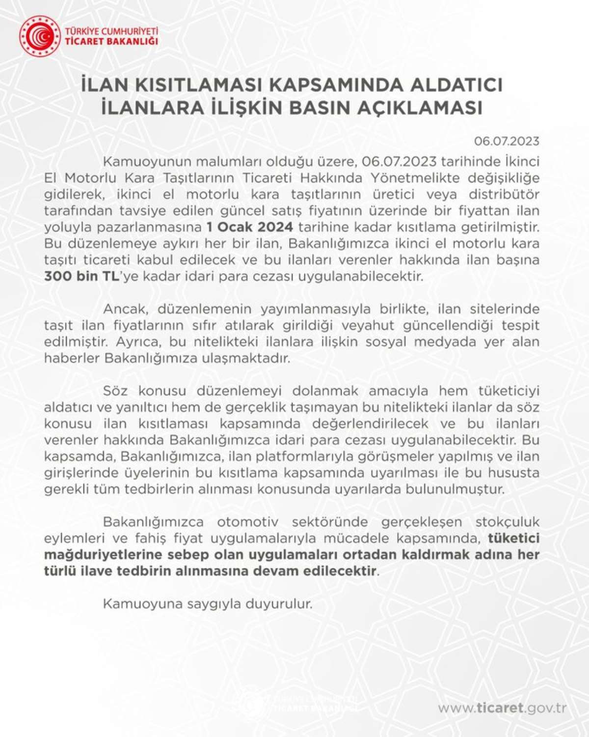 “Düzenlemenin yayımlanmasıyla birlikte, ilan sitelerinde taşıt ilan fiyatlarının sıfır atılarak girildiği veyahut güncellendiği tespit edilmiştir. Ayrıca, bu nitelikteki ilanlara ilişkin sosyal medyada yer alan haberler Bakanlığımıza ulaşmaktadır.