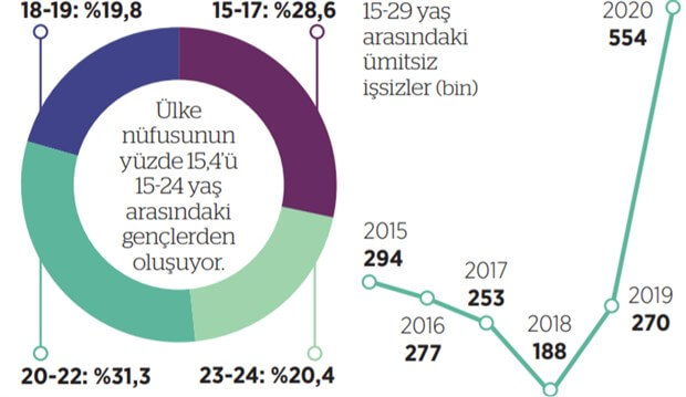 Her ile bir üniversite açılmasıyla birlikte üniversiteli yaşı 20-24 oldu. Ancak bu yaş grubundaki 3 milyon 269 bin genç ise iş gücü piyasasında yer alıyor. 2 milyon 540 bini ise çeşitli nedenlerden dolayı iş gücüne dâhil edilmiyor. Bu yaş grubunda en çok dikkat çeken ise çalışmaya hazır olduğu halde iş aramayanlar. İş aramaktan vazgeçenlerin sayısı son beş yılda yüzde 89,5 oranında arttı. 2020’de 20-24 yaş arasındaki 417 bin iş aramayıp çalışmaya hazır olduğu halde iş gücüne dahil edilmedi.