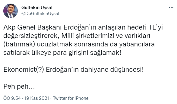 “AKP Genel Başkanı Erdoğan’ın anlaşılan hedefi TL’yi değersizleştirerek, Milli şirketlerimizi ve varlıkları (batırmak) ucuzlatmak sonrasında da yabancılara satılarak ülkeye para girişini sağlamak! Ekonomist(?) Erdoğan’ın dahiyane düşüncesi! Peh peh…”