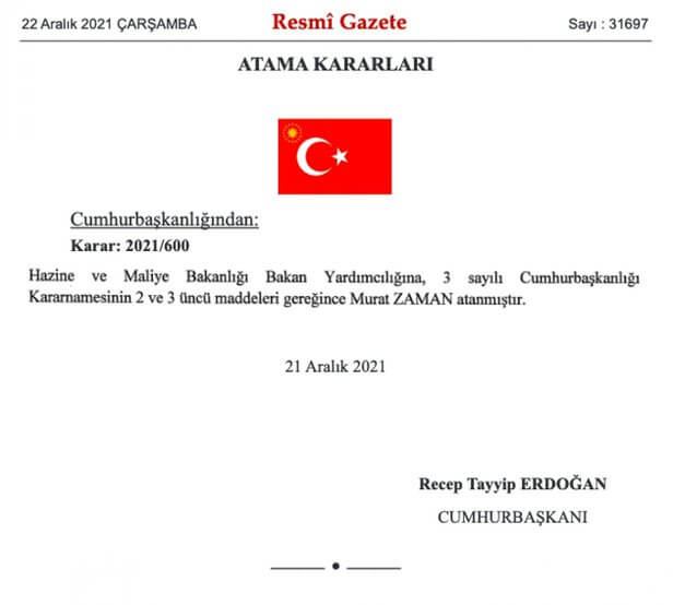 Cumhurbaşkanı Recep Tayyip Erdoğan’ın imzasıyla yayımlanan karara göre Hazine ve Maliye Bakanı Yardımcılığına Murat Zaman atandı.