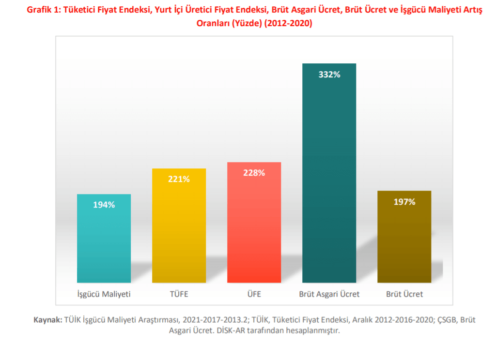 DİSK-AR araştırmasında “2012-2020 arasında brüt ücretler yüzde 197 artarken TÜFE yüzde 221 oranında arttı. Ücretler resmi enflasyonun altında kaldı. 2012’de ortalama ücret asgari ücretin 2,3 katı iken, 2020’de 1,4 katına geriledi. Sendikalı ve toplu iş sözleşmesinden yararlanan işçilerin aylık ortalama brüt kazancı diğer işçilerden yüzde 62 daha fazla.” değerlendirmesi yapıldı.
